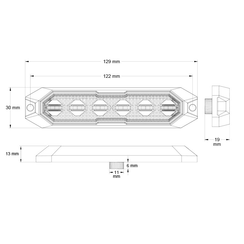 Informācija: 6 x 3W gaismas diodes: augstas intensitātes jauda, izstrādāta ekstremāliem apstākļiem: IP6K9K – temperatūras diapazons -30°C … +50°C, izturīga polikarbonāta lēca: 100% spilgtums un UV aizsardzība, plašs pielietojuma diapazons, 15 zibspuldzes modeļi , atmiņas atsaukšana, uzlabota funkcionalitāte – maiņa un sinhronizācija, 4 kabeļi, pastāvīga stiprinājuma iespēja: 2 x M4x16 skrūves – attālums 122 mm, putu spilventiņa blīve iekļauta drošībai.